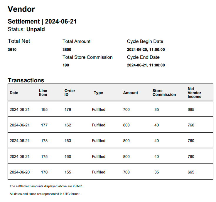 The settlements screen displays the order item ID, order date, order state, order amount, and store commission for the vendor.