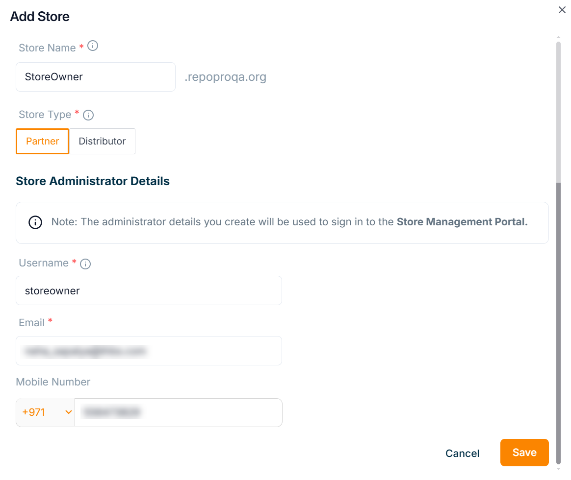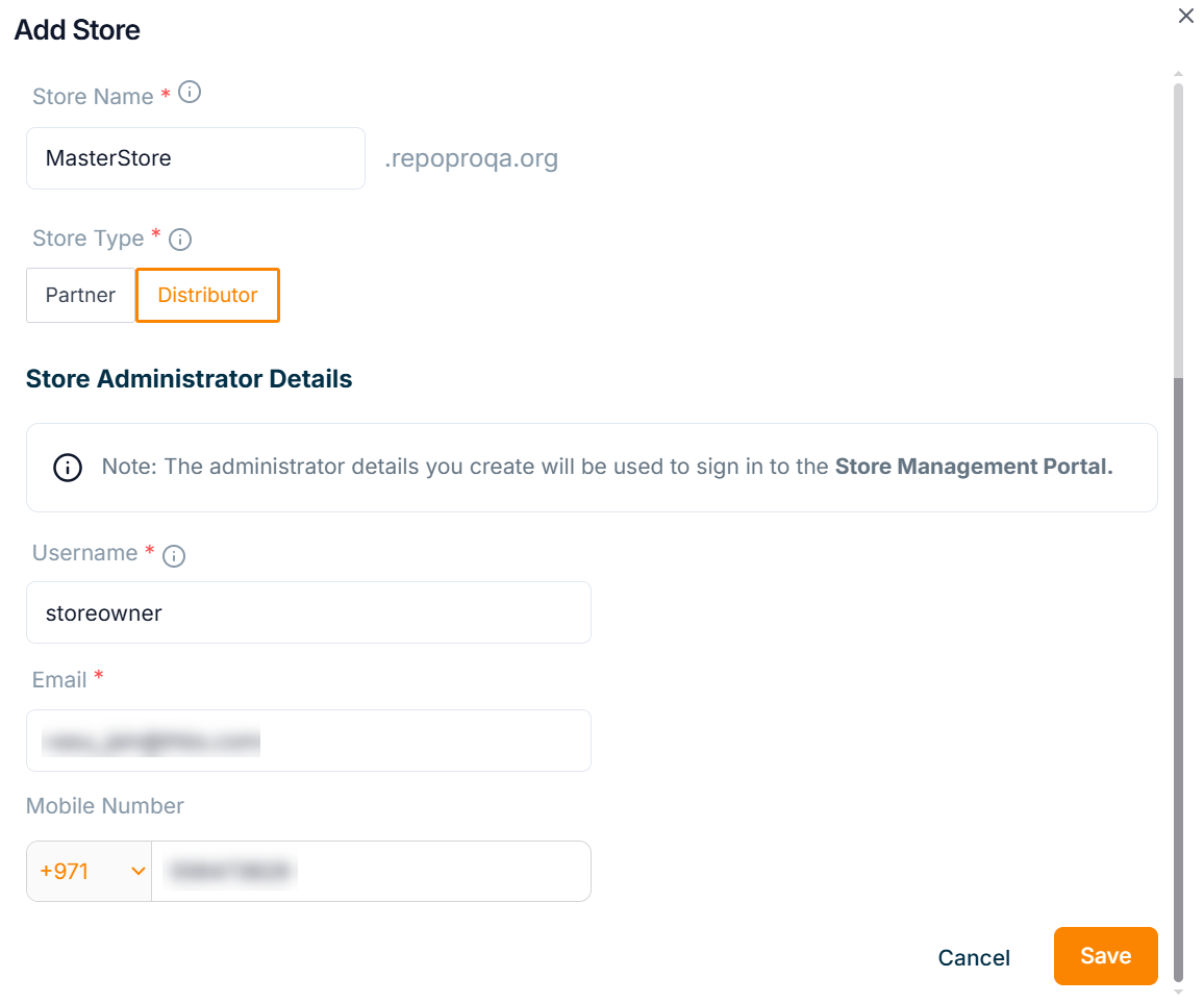 As a Admin, you can choose Partner or Distributor when creating a store. Only one distributor is allowed per instance, and it can't be reverted to partner or deactivated. Existing stores can be set as distributor.