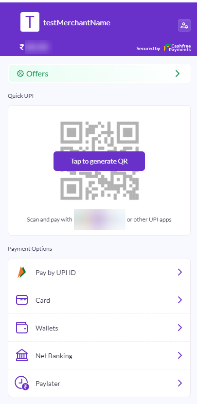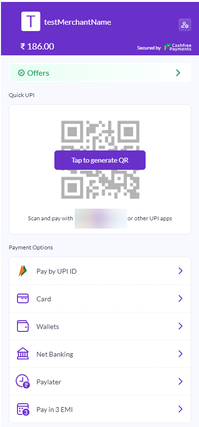 i. Click on Tap to generate the QR Code or Select any Payment Options.