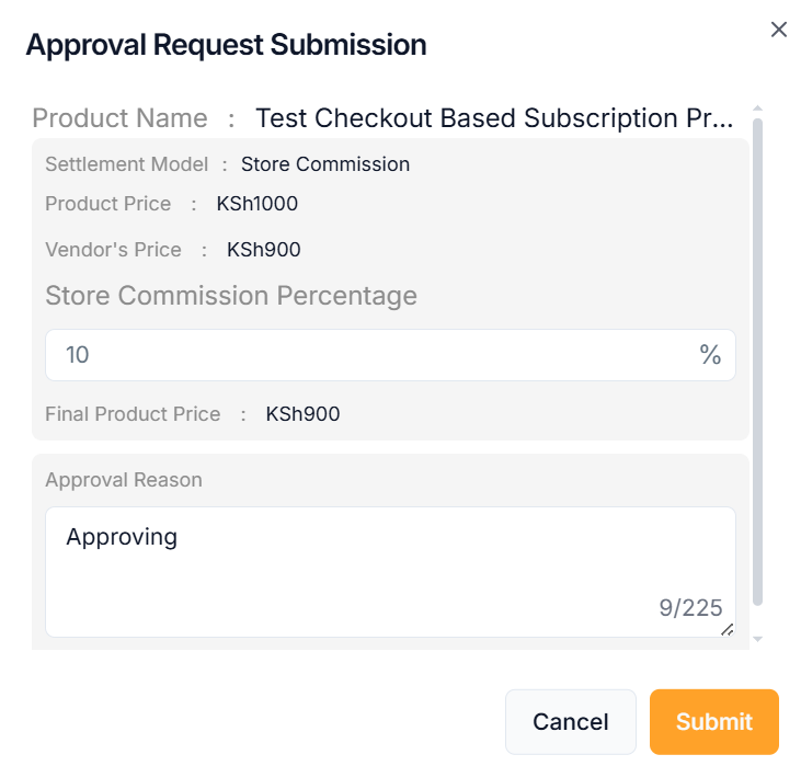 In the Approval Request Submission, the final product price reflects the vendor's price, and store commission is calculated based on the product price.
