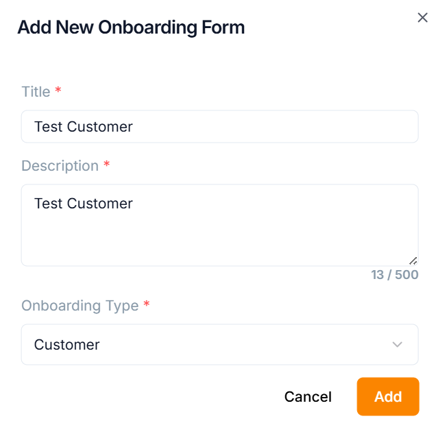 The Add New Onboarding Form dialogue box appears as shown below.