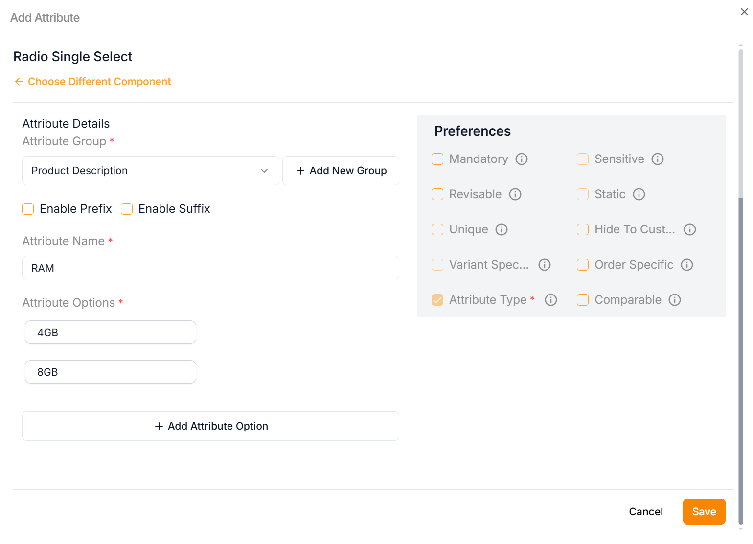 Example of creating an variant attribute using a Radio Single Select: