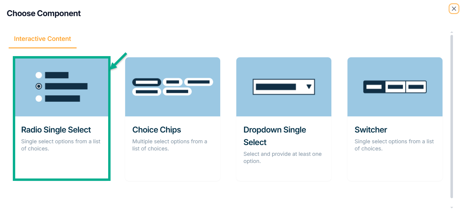 Radio Single Select - Used when a user must make exactly one choice from a list of two or more alternatives.