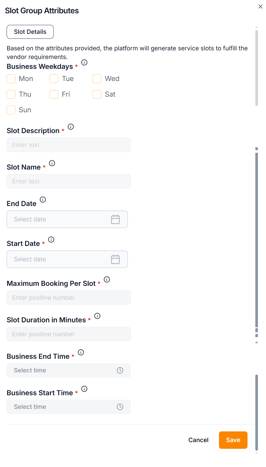 Configure the Service product template slot details before submitting the product template for approval.