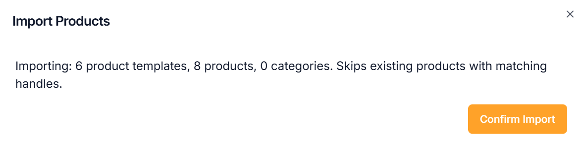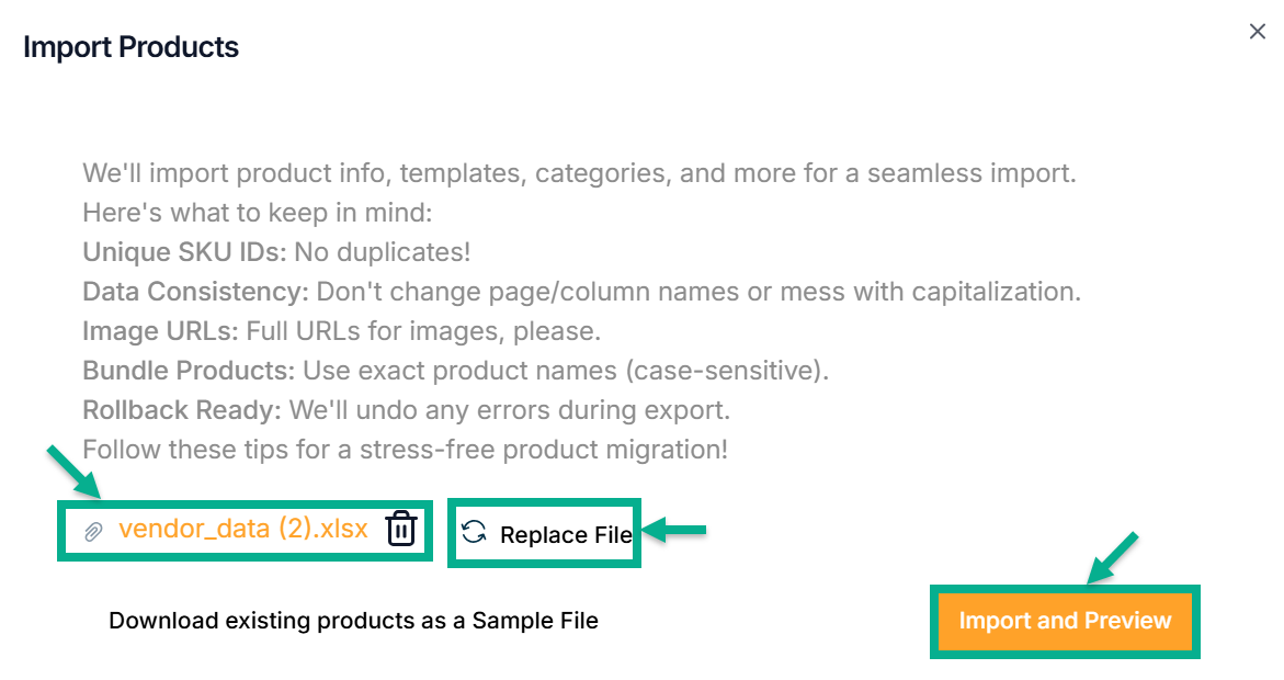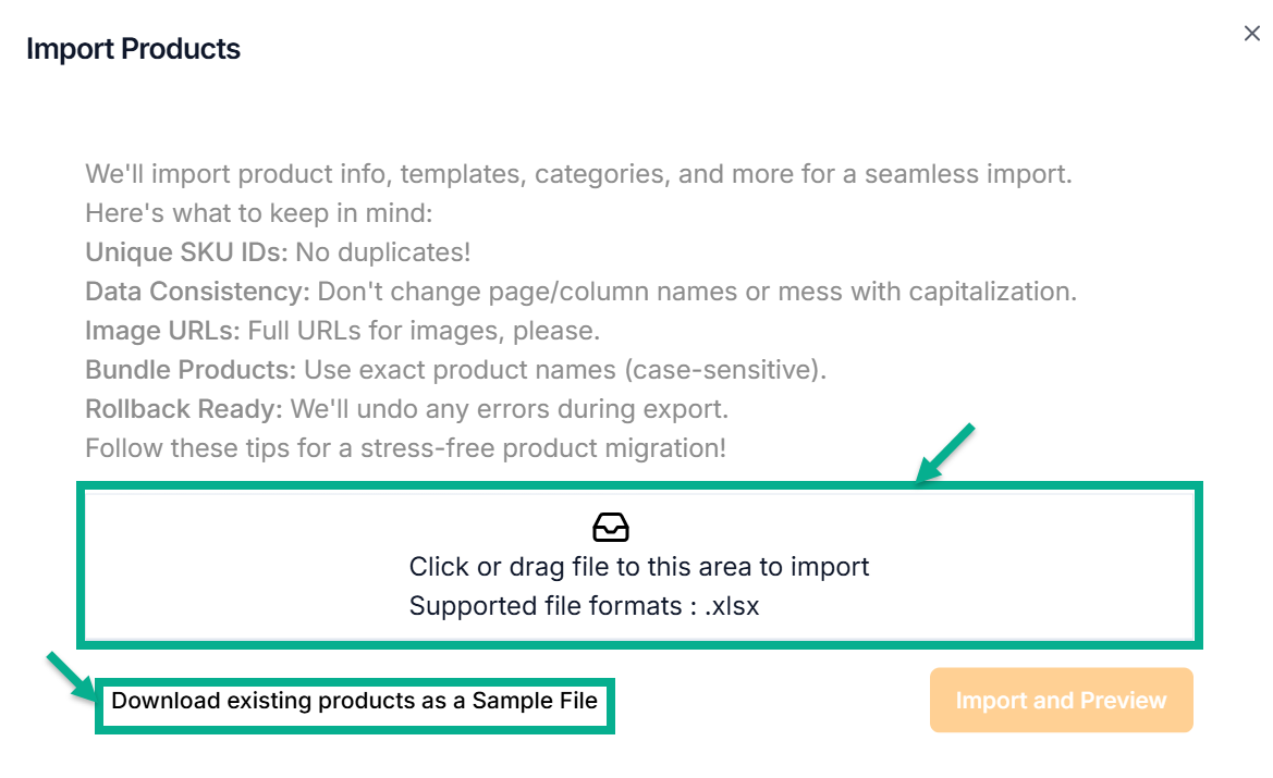 - To import the products and product templates, click or drag the file into the highlighted area.