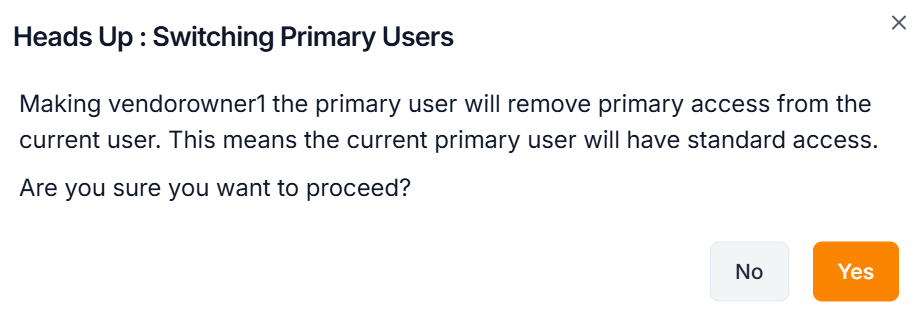 Only a primary vendor owner can make another vendor owner a primary user and other vendor owner are unable to upgrade themselves or other users as primary user.