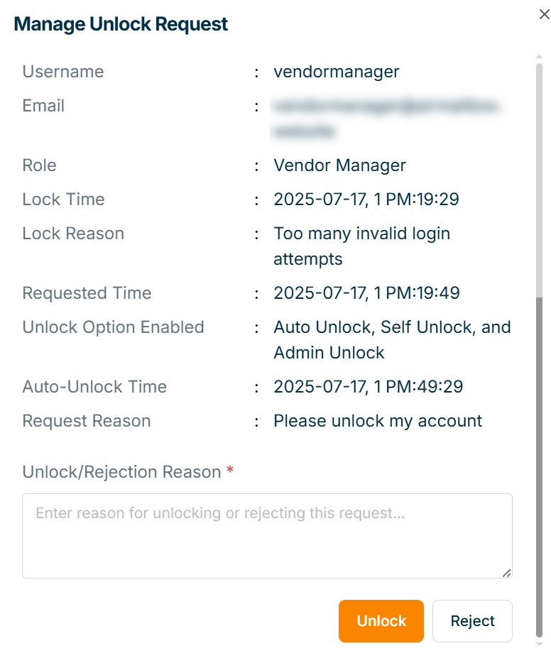 If vendor selects the Self Unlock Configuration as Email with unlock link: